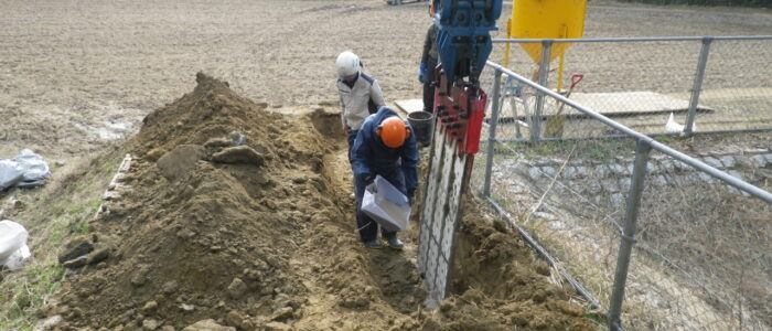 ため池堤防幅が3m程と狭いため、ブレーカーユニットに取り付けたプレートガイドを90°回転して取付け、縦打ち使用に換装して施工を行いました。